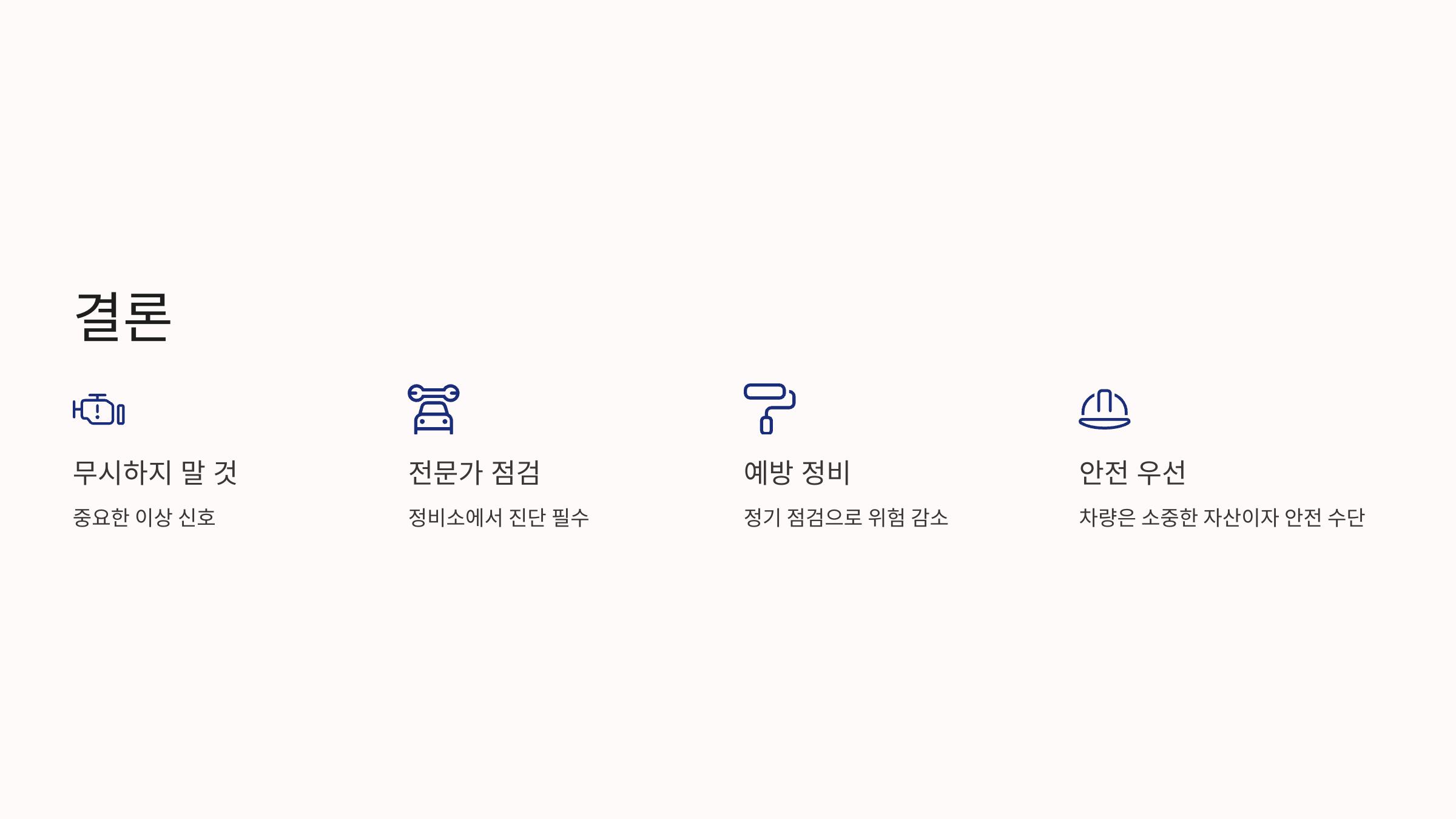 - 차량이 평소와 다르게 떨리거나 출력이 약해졌다면 즉시 점검이 필요