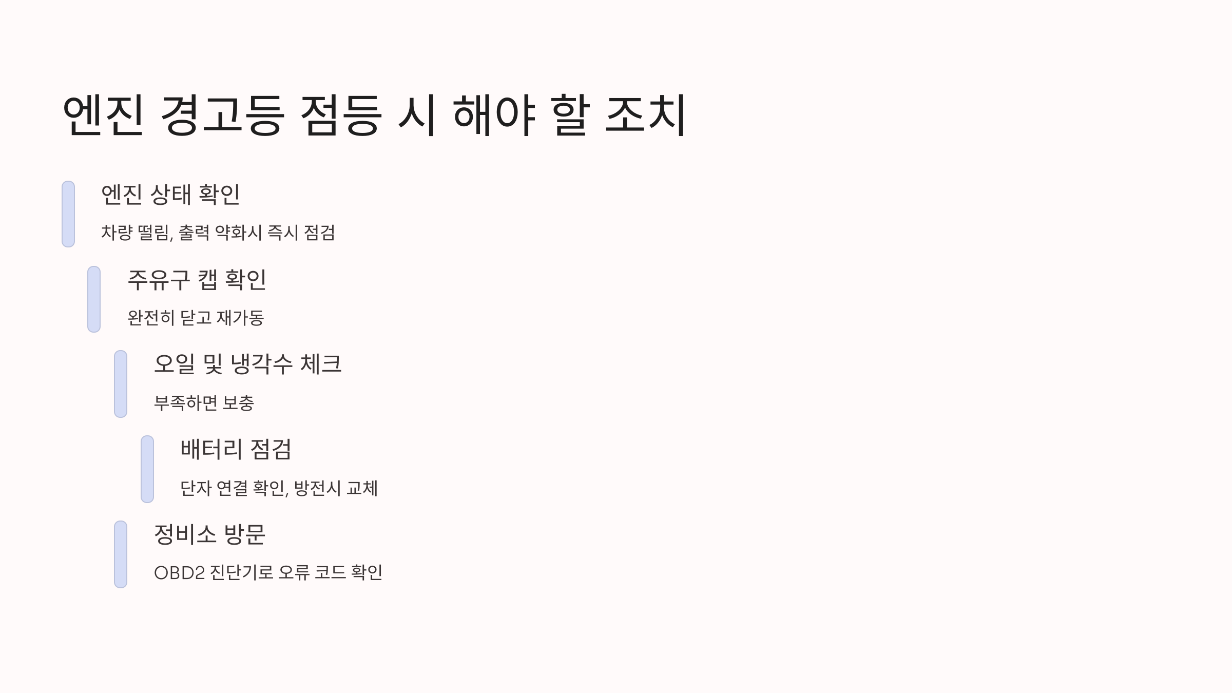 경고등이 켜졌을 때는 당황하지 말고, 아래 절차에 따라 차근차근 확인해야 합니다.