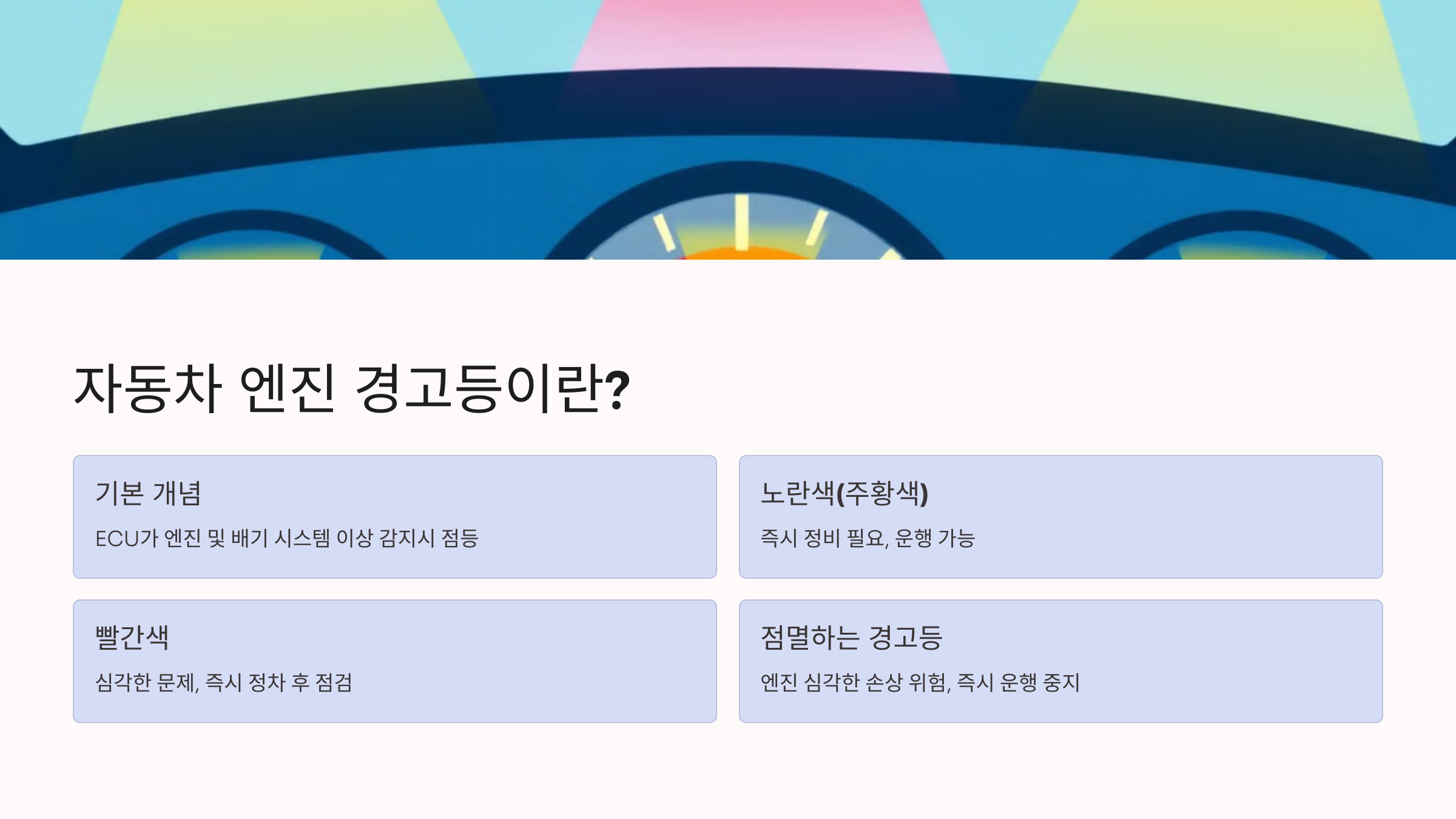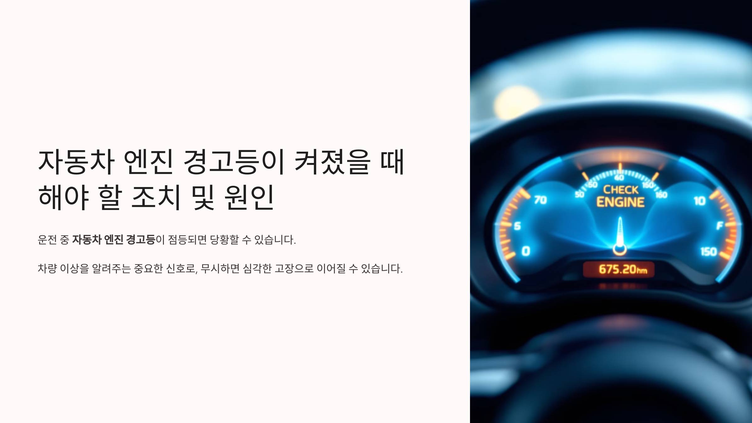 이번 글에서는 자동차 엔진 경고등이 켜지는 원인과 상황별 대처 방법을 상세히 안내해 드리겠습니다.