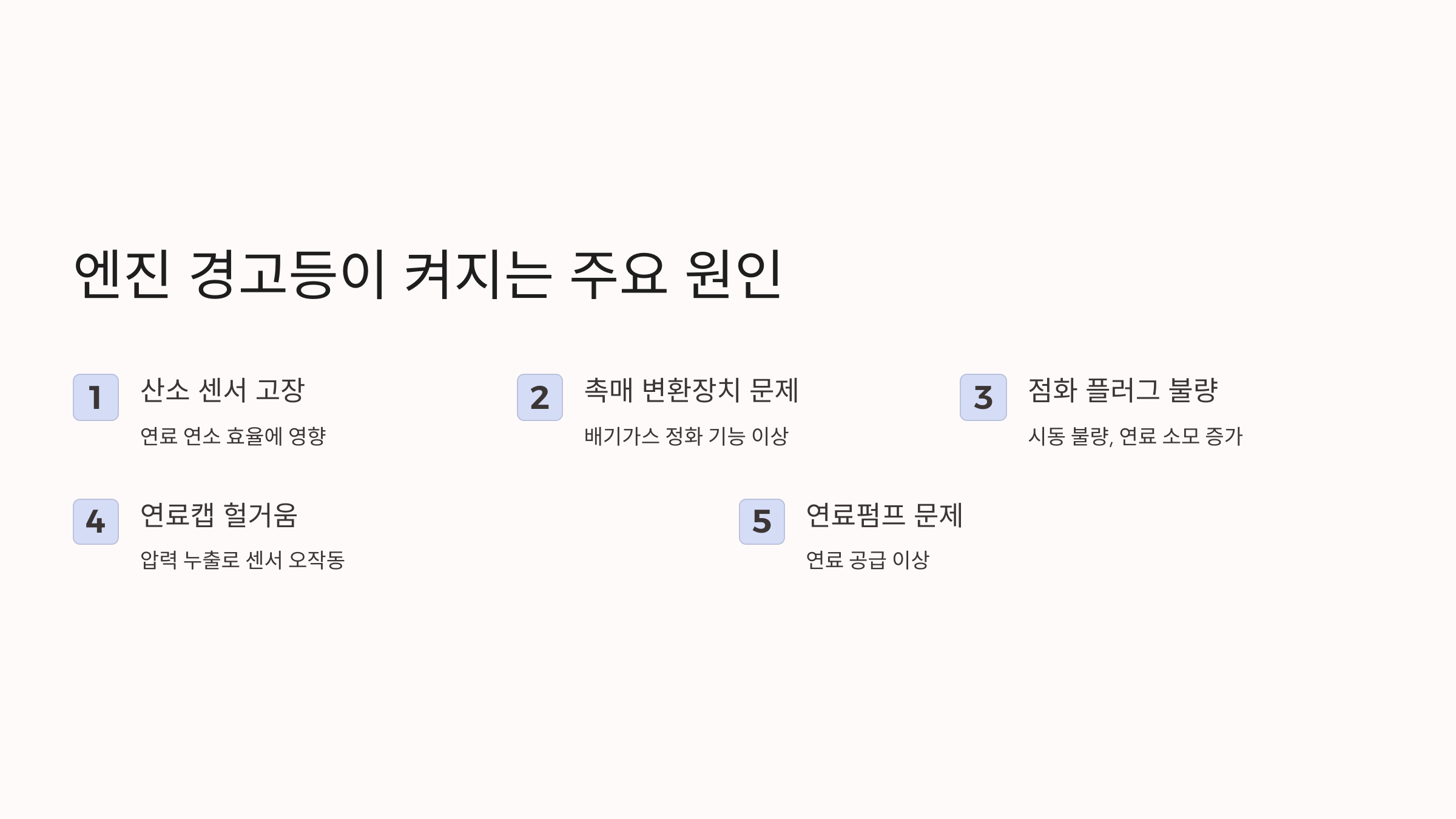 엔진 경고등이 켜지는 원인은 다양합니다. 간단한 문제일 수도 있고, 심각한 엔진 결함의 신호일 수도 있습니다.